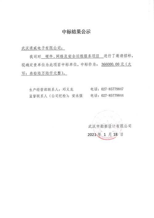 武漢市勘察設(shè)計(jì)有限公司硬件、網(wǎng)絡(luò)及安全運(yùn)維服務(wù)項(xiàng)目中標(biāo)結(jié)果公示